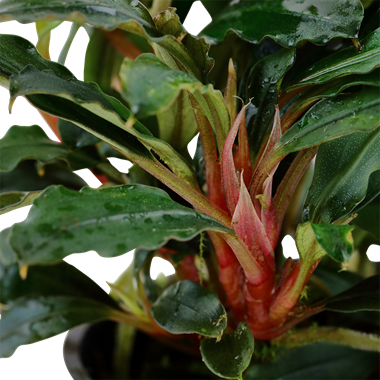 Bucephalandra sp. 'Red' does best at lower light levels and is very easy to grow. The leaves are of a very dark green or leathery red colour. Numerous tiny, white dots and sometimes a faint, metallic, blue colour will appear on submerse leaves. Size of leaf is 2-4 cm wide, 4-6 cm long and usually it will present wavy edges.